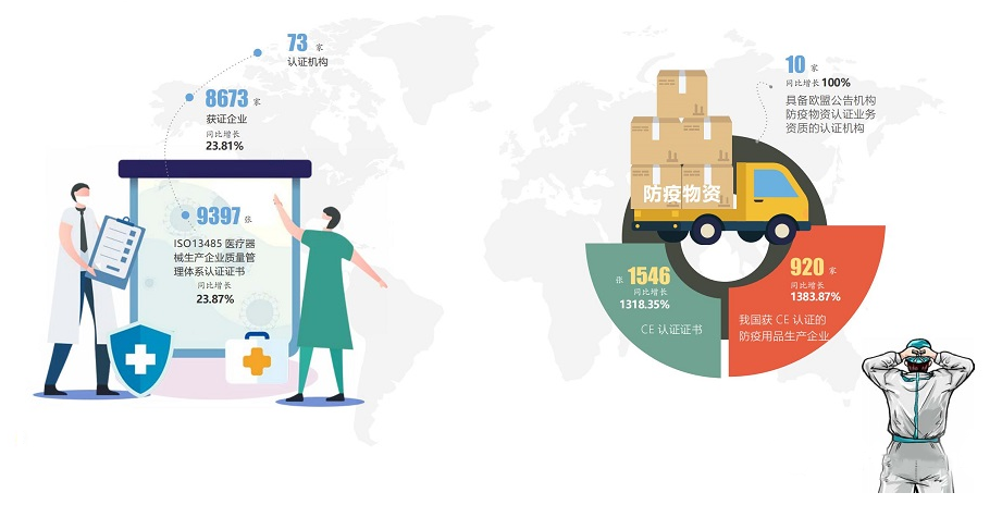 支持我国防疫物资生产,截至2020年底,我国73家认证机构累计发放ISO13485医疗器械生产企业质量管理体系认证证书9397张,获证企业共计8673家。