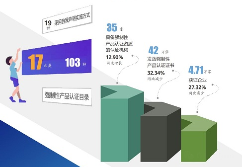 深化强制性产品认证制度改革,将强制性产品认证目录优化整合为17大类103种,其中19种产品采用自我声明实施方式,切实为企业减负。