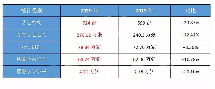 截至2020年底,我国认证机构共计724家(不含港澳台),有效认证证书270.12万张,获证组织78.84万家,2020年度共计255家认证机构扩大了认证业务范围,共计扩项816项次。