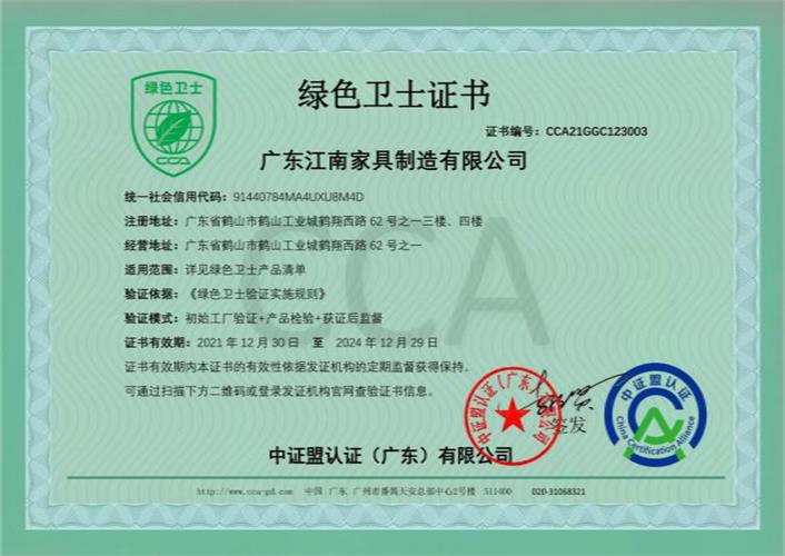 广东江南家具制造有限公司顺利获得绿色卫士证书