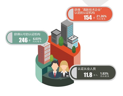 截至2020年底,认证从业人员共计11.8万人,获得“高新技术企业”认定的认证机构共计154家,获得认可的认证机构共计246家。