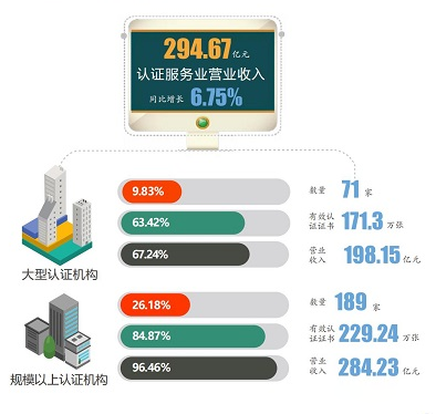 2020年度,认证服务业营业收入共计294.67亿元。其中,大型认证机构(300人以上)共计71家,累计发放有效认证证书171.3万张,营业收入198.15亿元;
