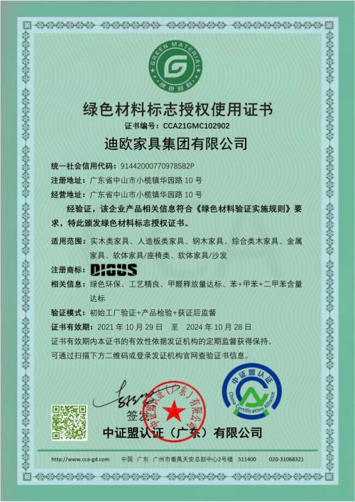 迪欧家具集团有限公司顺利获得绿色材料授权使用证书