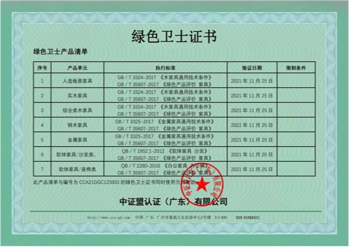 广东江南家具制造有限公司顺利获得绿色卫士证书