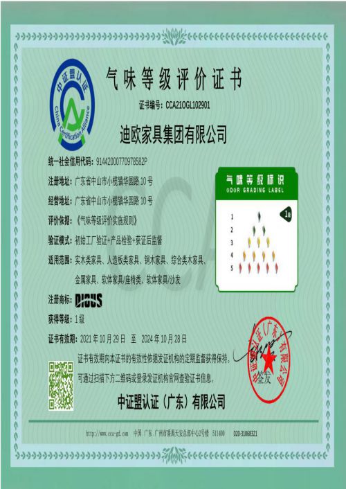 迪欧家具集团有限公司顺利获得气味等级评价证书