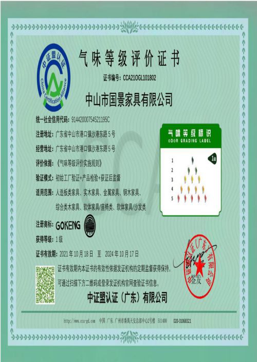 中山市国景家具有限公司顺利获得气味等级评价证书