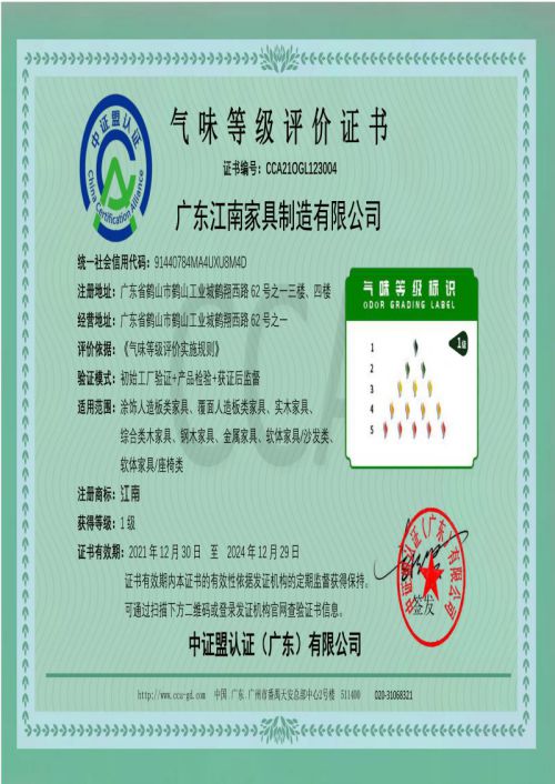 广东江南家具制造有限公司顺利获得气味等级评价证书