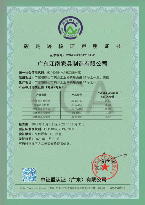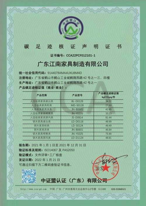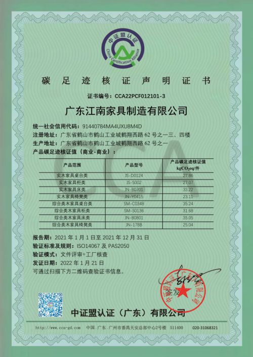 广东江南家具制造有限公司顺利获得碳足迹核证声明证书