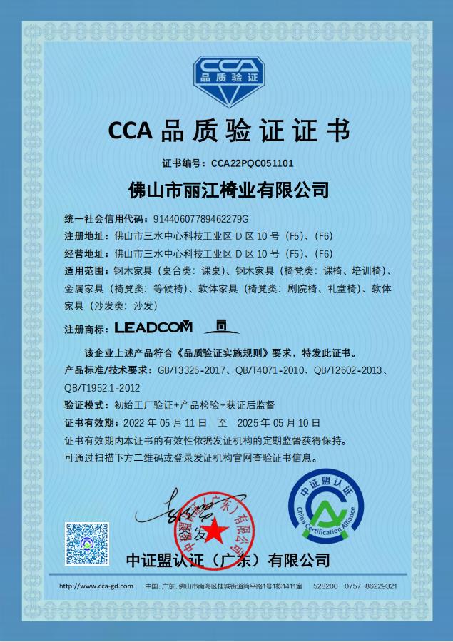 佛山市丽江椅业有限公司顺利获得CCA品质验证证书