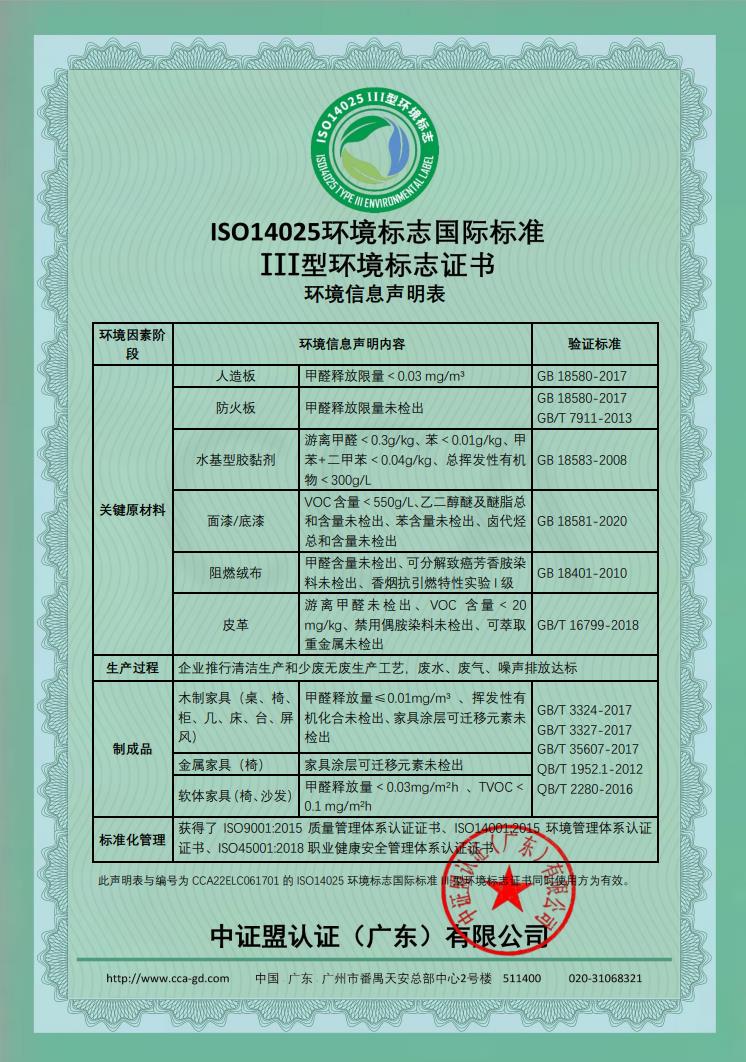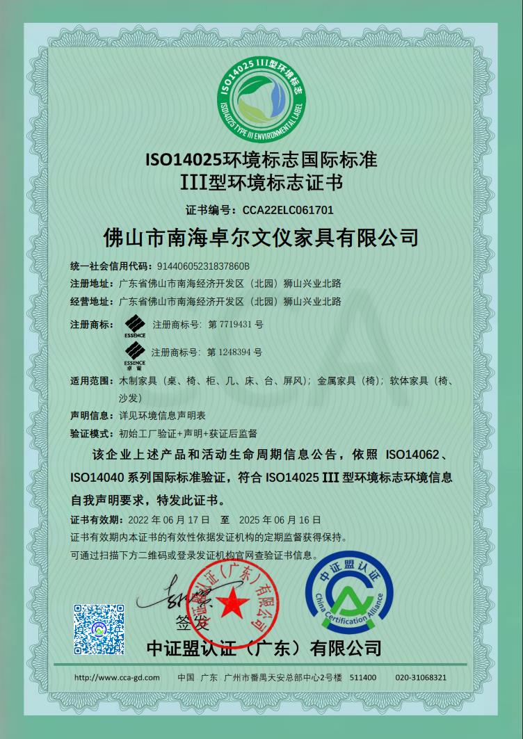 佛山市南海卓尔文仪家具有限公司顺利获得ISO14025III型环境标志证书