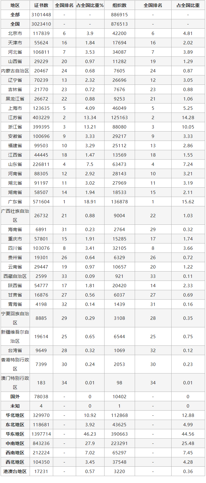 其中证书数10万以上的省、市9有个,分别为广东571604张、江苏403229张、浙江399395张、山东226811张、上海123635张、北京117839张、河北106811张、四川省103076张、和安徽省100696张。