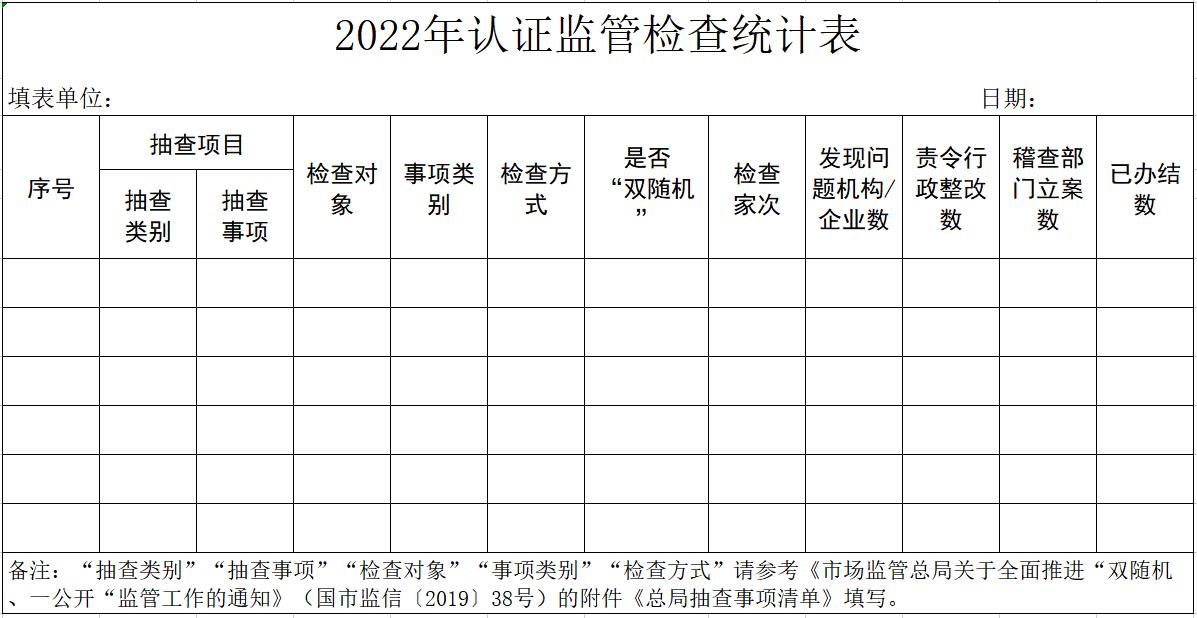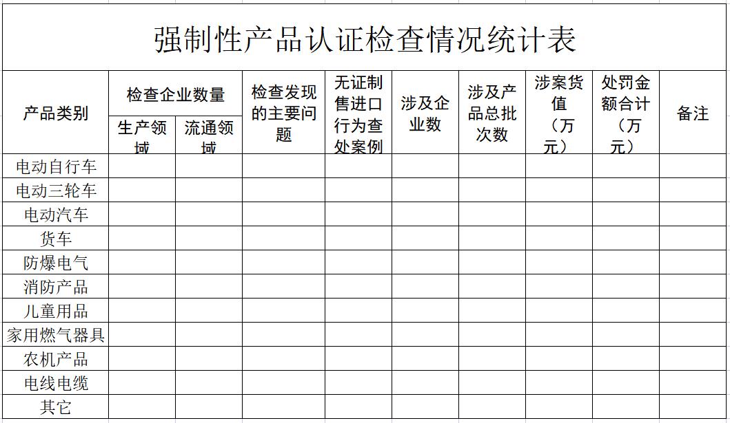 (三)加强信息报送。各市、省直管县(市)局于10月底前完成全部检查任务,并将认证监督检查工作总结连同《强制性产品认证检查情况统计表》《2022年认证监管检查统计表》一并报送。
