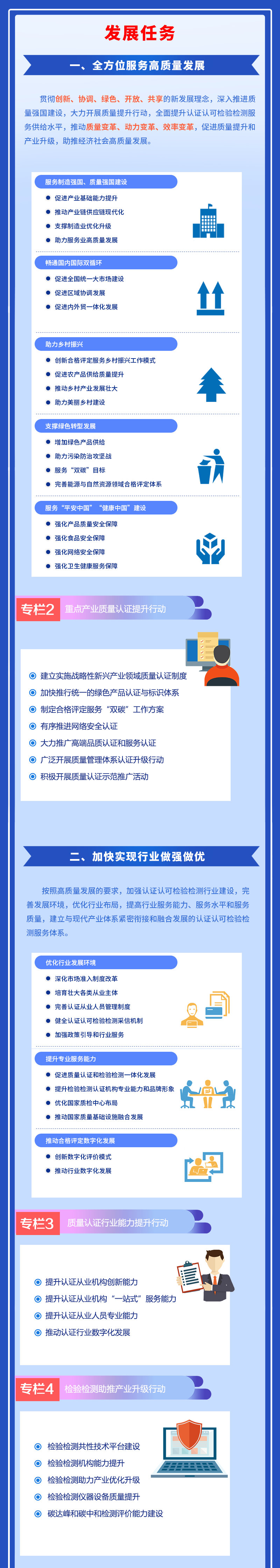 为统筹推进“十四五”时期认证认可检验检测行业发展,《规划》从全方位服务高质量发展、加快实现行业做强做优、大力提升行业治理能力、切实提高国际合作水平、着力夯实基础支撑体系等方面部署了5大发展任务,并设置了重点产业质量认证提升、质量认证行业能力提升、检验检测助推产业升级、认证认可检验检测行业监管体系建设以及“合格评定,畅通世界”5个专项行动。