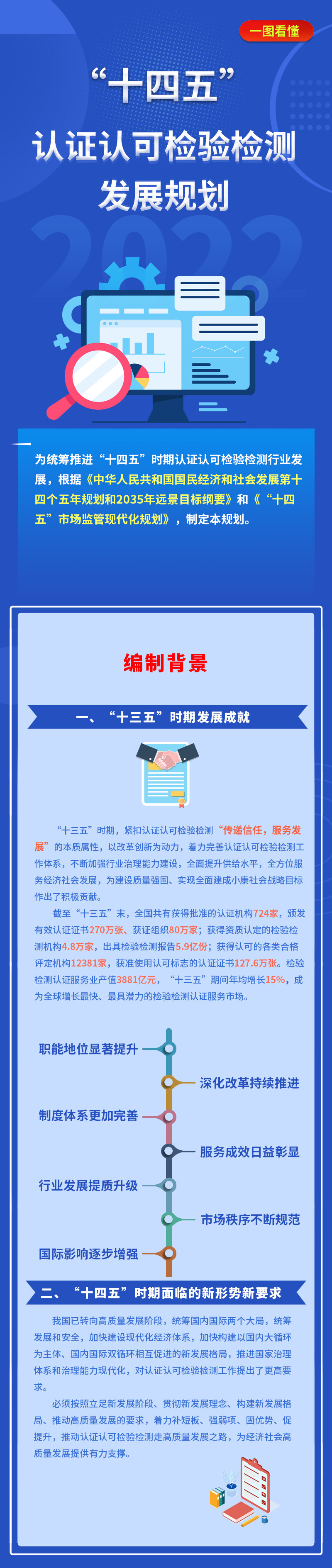 《规划》明确了“十四五”时期认证认可检验检测发展的总体要求、发展目标、发展任务和保障措施。按照“坚持党的领导、坚持系统观念、坚持市场主导、坚持统筹兼顾、坚持多元共治”的基本原则,加快构建统一管理、共同实施、权威公信、通用互认的认证认可检验检测体系,努力实现“市场化改革取得新进展、国际化发展实现新突破、专业化提升达到新水平、集约化整合形成新格局、规范化发展呈现新面貌”等发展目标。在推进市场化改革方面,深化强制性产品认证、认证机构资质审批、检验检测机构资质认定等领域改革,有效激发市场活力;在推进国际化发展方面,全面提升我国认证认可制度的国际互认度,合格评定机构的国际化业务水平,形成一批具有国际影响力的制度品牌和机构品牌;在推进专业化提升方面,全面提升认证认可检验检测服务供给能力,关键领域认证认可检验检测技术实现安全可控;在推进集约化整合方面,检验检测认证行业“小散弱”现象得到明显改观,结构布局更加合理;在推进规范化发展方面,完善以法律规范为准绳、以行政监管为主导、以认可评价为约束、以行业自律为基础、以社会监督为制约的监管体系,认证认可检验检测行业的社会公信力明显提升。